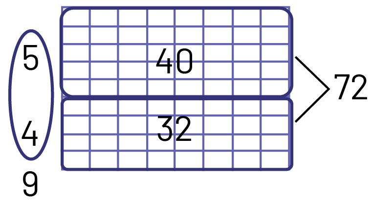 I made my array by making rows of 8 to represent the groups of children. I know that \(5 \times 8 = 40\), so I made 5 rows. I subtracted 40 from 72, which gave me 32. I know that \(4 \times 8 = 32\), so I add 4 more rows of 8 to get my 72.