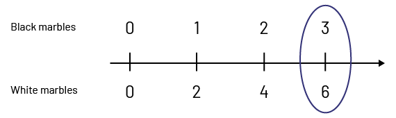 There are 3 black marbles and 6 white marbles. This means that the white marbles are twice the black marbles. Using a double number line, the top number shows a scale by one and the bottom number shows a scale by 2. In this scaling of 1 to 2, we see that the white marbles are always double the black marbles.