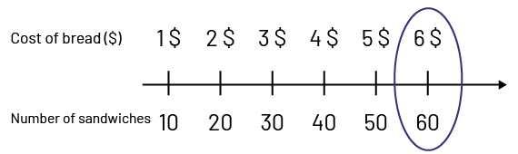 Using a double number line, the top number shows a scaling by one, which is the cost of bread, and the bottom number shows a scaling by 10, which is the number of sandwiches. The ratio here is 1 to 10 since the multiplicative relationship between 2 and 20 is 10.