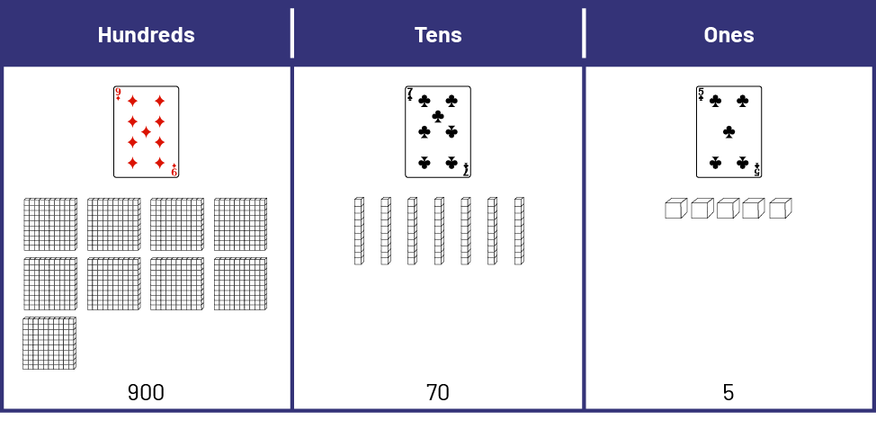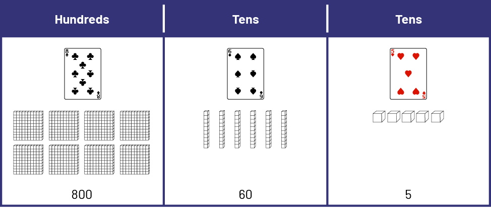 In order to form the greatest number, Peter chooses to use the place value mat. While analyzing his cards, he decides to discard the 3 card. With the remaining three cards, he makes the number 865. Jamila decides to discard the 4 card. With the remaining three cards, she makes up the number 975. To compare their numbers, students use base ten blocks laid out on a place value mat as shown below.