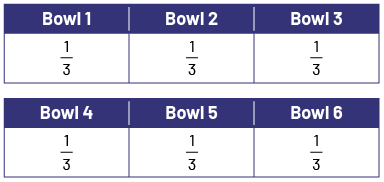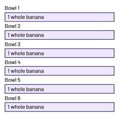 There are 2 rectangles left, which represents 2 whole bananas. I need to cut the 2 bananas and divide the pieces into the 6 bowls. If I divide the bananas into 3 equal parts, or thirds, I will be able to put one piece in each bowl.
