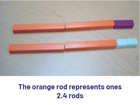 Once students have become accustomed to recognizing tenths, concrete materials can be used to introduce decimal notation. Here is a concrete representation of the number 2.4.