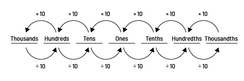 It is important that students also grasp the x 10 multiplicative relationship that exists between adjacent place values. Students have previously developed an understanding of this relationship in the study of whole numbers, such that each place has a value 10 times greater than the one to its right and 10 times less than the one to its left.