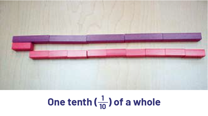 Base ten blocks are excellent tools to represent decimal numbers, since they highlight the x 10 multiplicative relationship between place values. However, it is very important to always clearly define the block that constitutes the whole, from which the other pieces will be defined. When studying whole numbers, the small cube was usually associated with one whole. However, if we choose the rod as the whole, then the small cube represents one tenth.