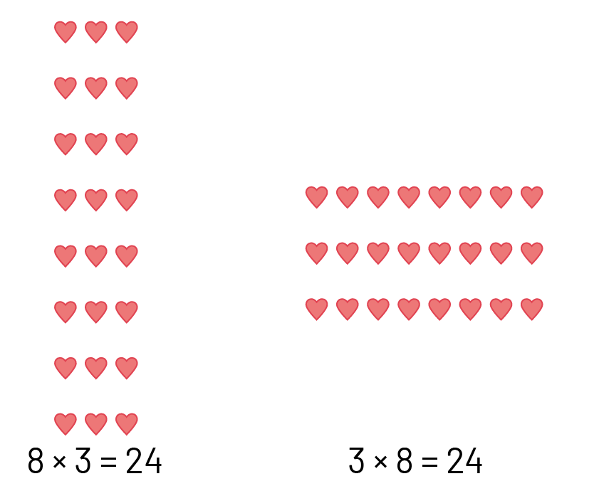 We can also demonstrate the commutative property of multiplication. For example, \(\ 8 \times 3\) and \(\ 3 \times 8\).