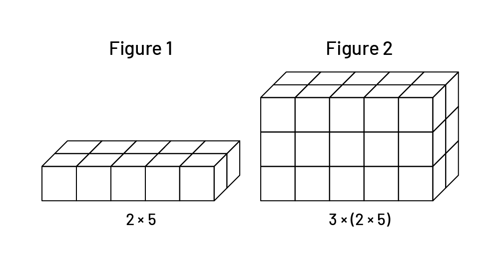 In Figure 1, we see that there are 2 rows of 5 cubes, that is, \(2\; \times \;5\) cubes. In Figure 2, we see 3 layers of \(2 \times 5\) cubes representing \(3\; \times \;(2\; \times \;5)\) cubes.