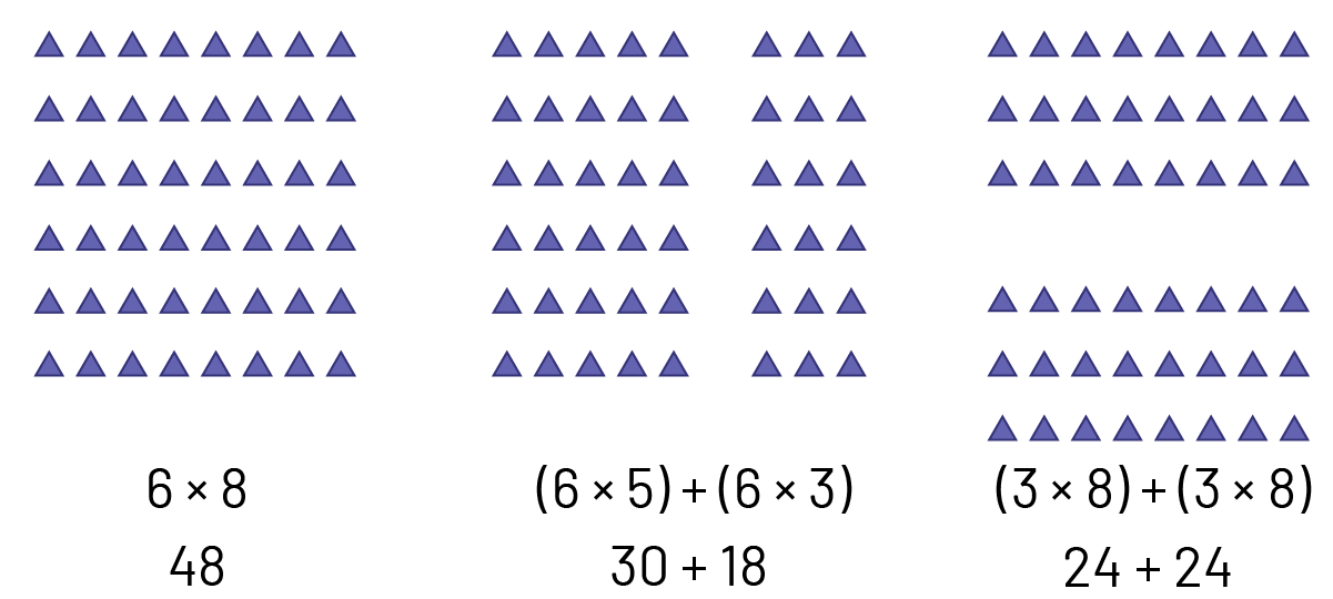 The following example illustrates how the distributive property can be used to calculate \(6\; \times \;8\). In the first case, we decompose the factor 8 into \(5\; + \;3\). Then we have \(6\; \times \;\left( {5\; + \;3} \right)\; = \left( {6\; \times \;5} \right)\; + \;\left( {6\; \times \;3} \right)\). In the second case, we decompose the factor 6 into \(3\; + \;3\). We then have \(\left( {3\; + \;3} \right)\; \times \;8\; = \left( {3\; \times \;8} \right)\; + \;\left( {3\; \times \;8} \right)\).