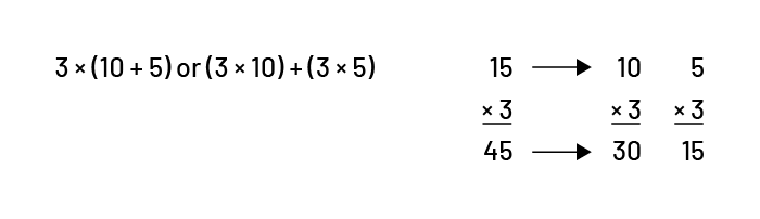 There is an important relationship between the distributive property and the usual multiplication algorithm. For example, to calculate \(3\; \times \;15\), the 15 is decomposed into \(\left( {10\; + \;5} \right)\):