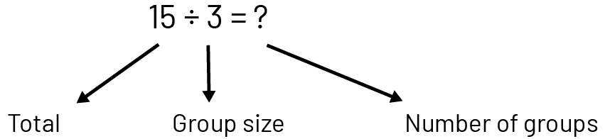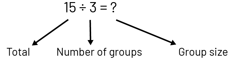 With equal-grouping division, the total quantity and the size of groups are known and the number of groups is unknown (for example, we have 15 apples and we want to put them in bags, 3 apples per bag; we look for the number of bags we need).