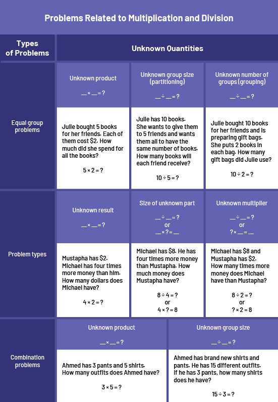 It is essential that both types of situations be addressed, as they are the basis for the integration of other mathematical concepts. It is not necessary for students to know the names of the situation types, but it is essential that they have the opportunity to solve a variety of problem types, while using a variety of strategies.