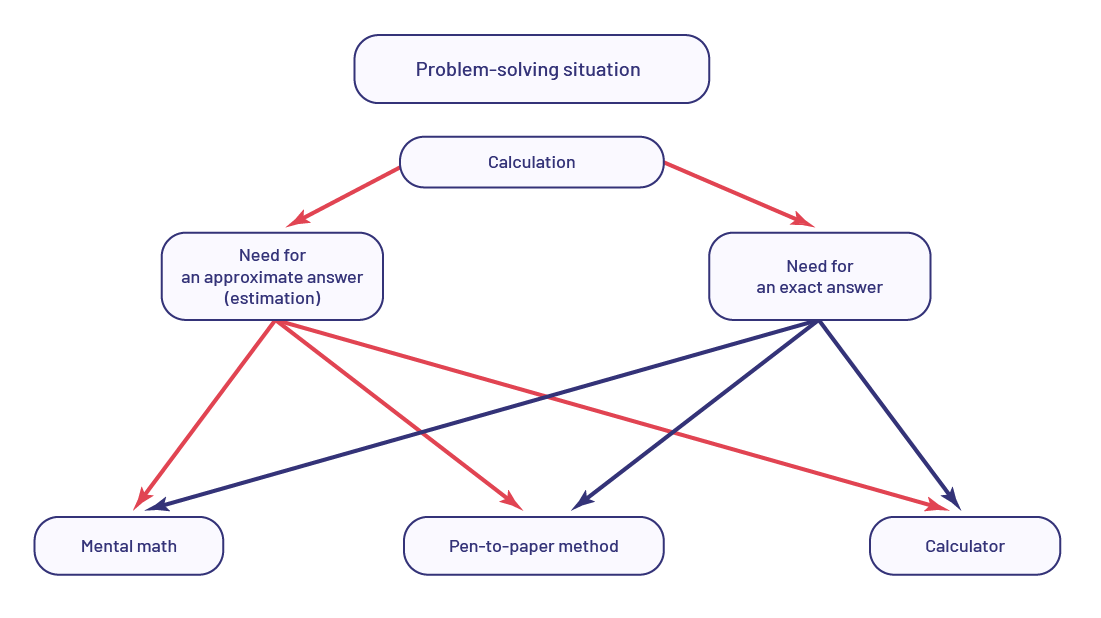 Whether it is a problem with one operation or multiple operations, students must make decisions and choices based on the context. A problem-solving approach will introduce them to this thinking. When faced with a problem, they must first analyze it to determine the data and understand that a calculation must be performed. Then, depending on the context, one must know whether one is looking for an approximate or an exact answer. In both cases, depending on the context and the numbers involved, it is then necessary to determine whether the calculation will be performed mentally, in writing or using a calculator. Finally, the desired calculation is performed.