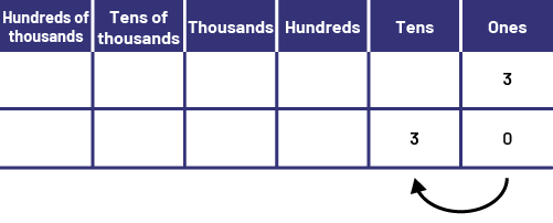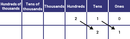 Multiplying a whole number by 10 can be visualized as a shifting of the digit(s) to the left by one column on a place-value mat.