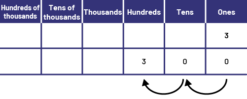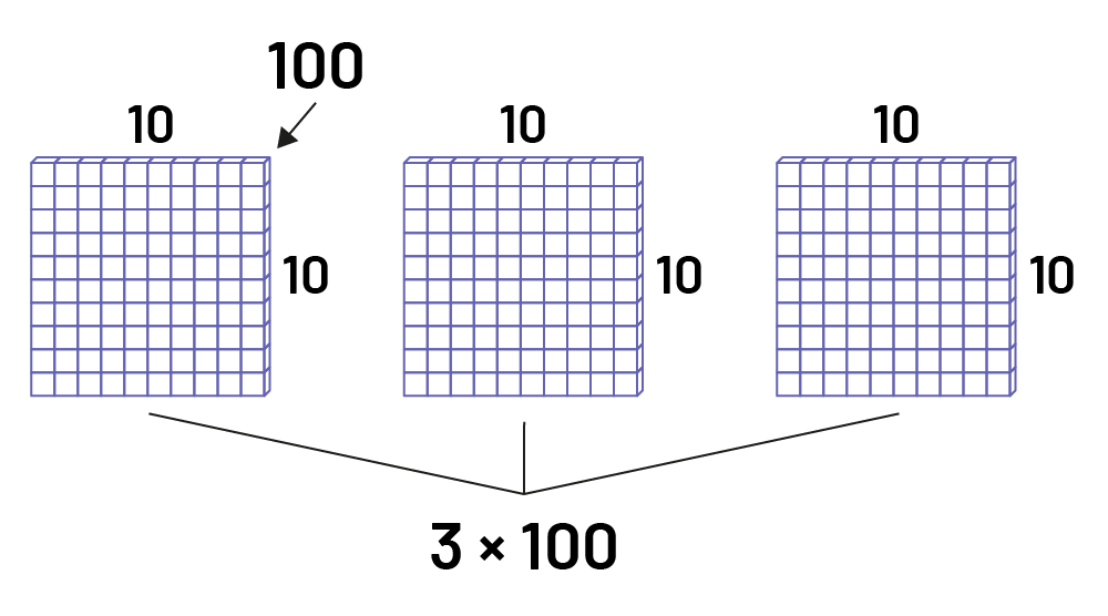 The student can also visualize 3 flats of \(\ 10\; \times 10\) to perform the multiplication \(\ 3 \times 100\).