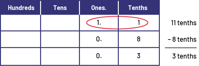 The student may conclude that one and one tenth is the same as eleven tenths. Using words, it is easier to perform the subtraction of eleven tenths minus eight tenths, which results in 3 tenths.