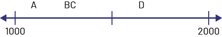 Draw a number line on the board to represent any range (for example, 1000 to 2000). Place some letters (for example, A, B, C, D) in this range as shown below.