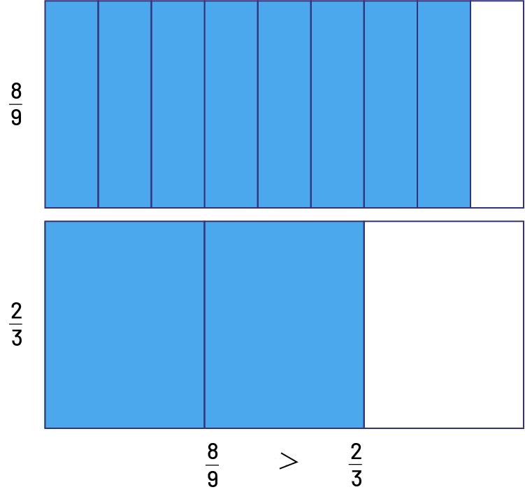 We want to compare \(\frac{8}{9}\) and \(\frac{2}{3}\). We can notice that each fraction lacks a part to make a whole. We thus recognize that for the fraction \(\frac{8}{9}\), \(\frac{1}{9}\) is missing to make 1, while for the fraction \(\frac{2} {3}\), \(\frac{1}{3}\) is missing. Since the missing part \(\frac{1}{3}\) is larger than the missing part \(\frac{1}{9}\), \(\frac{8}{9}\) is closer to 1 than \(\frac{2}{3}\). Thus, \(\frac{8}{9}\) is greater than \(\frac{2}{3}\).