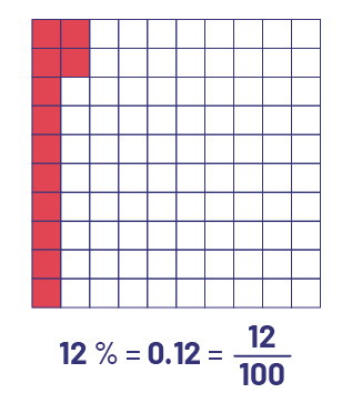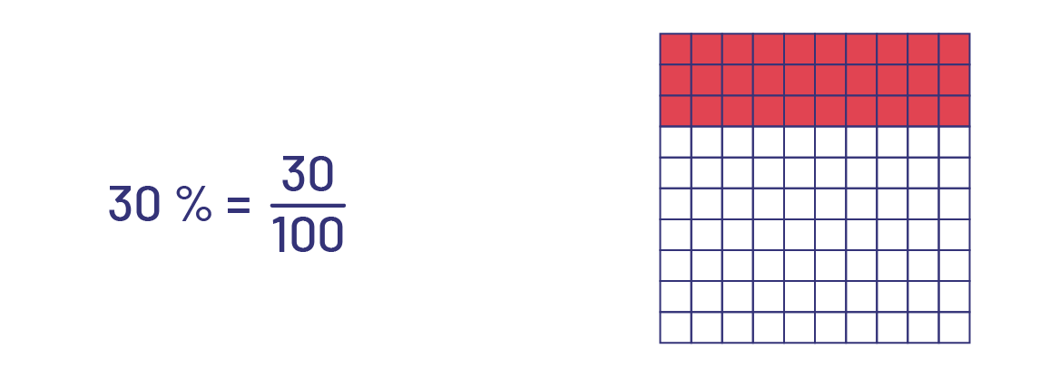 Percent is a kind of a fraction. It is often used in everyday life. A numerical expression such as 30% (which reads "30 percent") is actually another representation of the number 30 hundredths, or 0.30. To facilitate understanding of the concept of percent, students should first make the connection between percent and a fraction with a denominator of 100, using concrete or visual (semi-concrete) materials.
