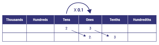 Multiply by one tenth is the same as dividing by 10. So to calculate 23 × 0.1, I visualized the number 23 divided into 10 equal groups. I decomposed 23 into 20 + 3.