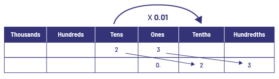 Multiply by one hundredth is the same as dividing by 100. So to calculate \(23\; \times \;0.01\), I visualized the number 23 divided into 100 equal groups. I decomposed 23 into 20 + 3.