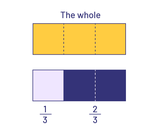 When working with fractions, the most important and sometimes the most difficult thing is to represent the whole correctly. In Grade 5, students add and subtract fractions with like denominators. With concrete or visual (semi-concrete) materials, the visual effect of addition and subtraction is enhanced. Drawing on their experiences with whole numbers and developing operation sense, students may recognize, for example, that adding 2 thirds (\(\frac{2}{3}\)) to 1 third (\(\frac{1}{3}\)) gives 3 thirds (\(\frac{3}{3}\)), or one whole.