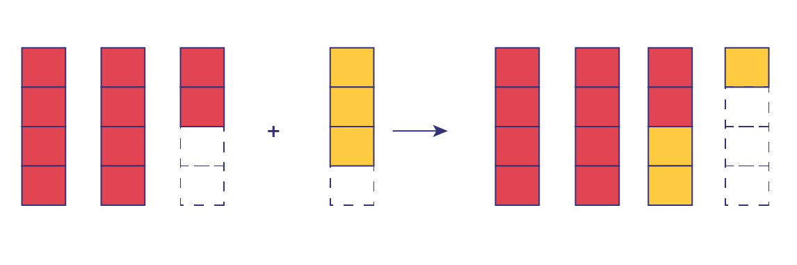 Students should also explore situations involving improper fractions. For example, the operation \(\frac{{10}}{4}\; + \;\frac{3}{4}\) could be represented using the following model.