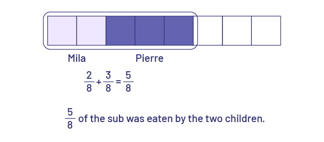 However, it is not always clear to students that the actual addition involves the numerator. In a situation where there are 3 eighths left of a pizza and 2 eighths left of another pizza of the same size, we look at how many are left in total. Are we counting eighths or sixteenths, since the pizzas had a total of 16 pieces? Students need to understand that the fraction always relates to the whole, which in this case is 8 pieces. One whole pizza has 8 pieces and each piece of pizza is \(\frac{1}{8}\) of the pizza, so we are adding eighths.