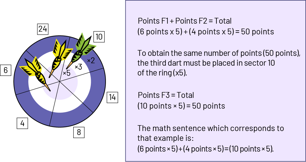 Initially, the focus is on the equal relationship between the points generated by one dart and the sum of the points obtained by two other darts. Later, through play, analysis of the game, and discussion, the importance of the distributive property as a game strategy will be highlighted.