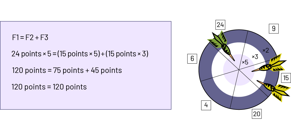 Usefulness: dialing the number 14 (\(8\; + \;6\)) helps find the area in which to place the third dart. The distributivite property makes the calculation easier.