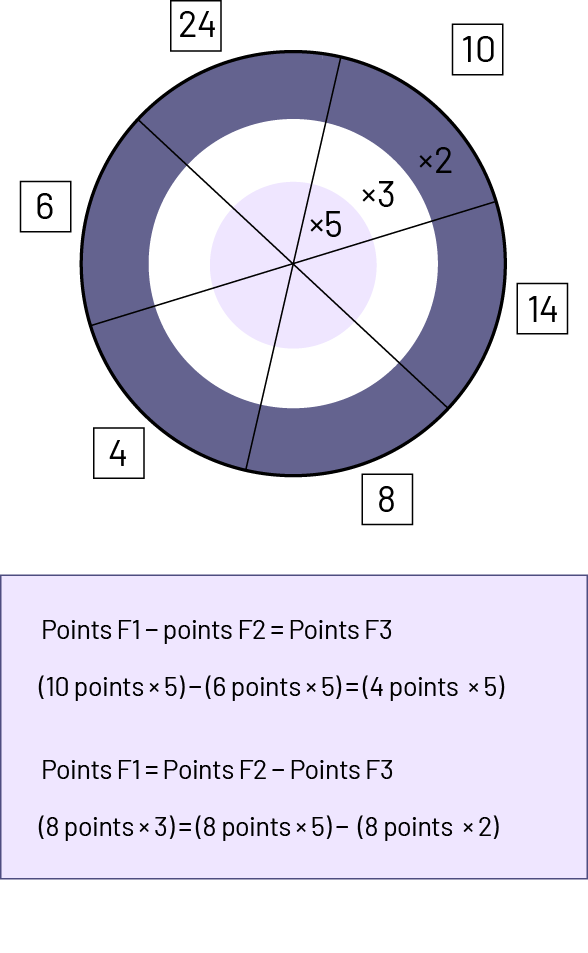 For Situation 4 in Appendix 6.4, students must add the missing points in three of the target areas by taking into account the number of points generated by the dart placed in area 24 of the ring \(\times \;5\).