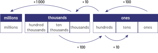 In the primary grades, students develop an understanding of the relationships among the place values of ones, tens, and hundreds. However, in the Junior and Intermediate Divisions, they do not automatically transfer this understanding to larger numbers. For this reason, teachers must ensure that students understand that the value of any position in a number is always 10 times larger than the value of the position immediately to the right, and 10 times smaller than the value of the position immediately to the left. It is also important to examine the hundredfold or thousandfold relationships between place values in order to develop students' deep number sense, including large number sense.