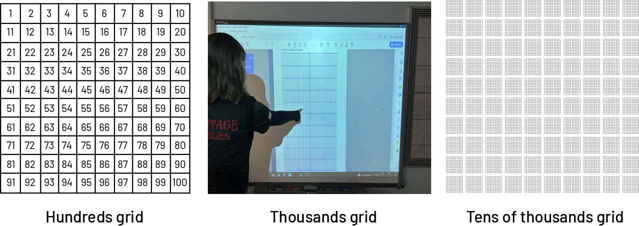 It is important for students to develop a variety of mental representations of numbers. These visualizations may simply represent quantities. For example, the "how many" of 100 000 can generate a mental representation of 100 grids of 1000. However, the presence of units in a situation may promote a different and more precise mental representation that would be related to a given situation. For example, students may visualize that 100 000 people represent 100 cars parked in 1000 parking lots in the city or 200 schools with 500 students.