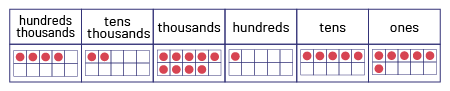The representation is ____ hundreds of thousands, ____ tens of thousands, ____ thousands, ____ hundreds, ____ tens and ____ ones.