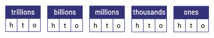 Numbers are represented symbolically by the digits that make them up. They are written from left to right in 3-digit periods that make up the trillions, billions, millions, thousands and ones. Each of the periods includes hundreds (h), tens (t) and ones (o).