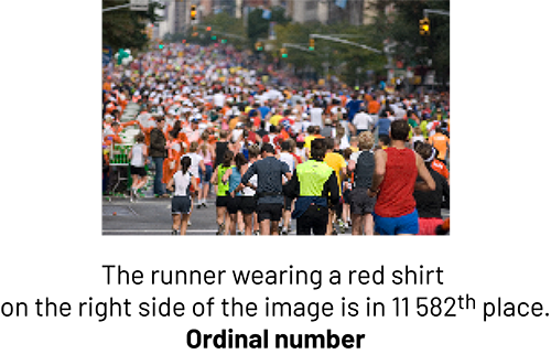 The context also allows us to recognize that the same number does not always have the same meaning. The common interpretation associates them with a quantity or cardinal number. However, some numbers do not represent quantities, but rather a position, as is the case of ordinal numbers. For example, in a marathon, the runner who is in 11 582nd does not represent 11 582 people, but rather is the 11 582nd person to cross the finish line. Numbers can also be used to label or identify as is the case with social insurance numbers, bar codes, license plates and addresses.