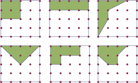 The word fraction comes from the Latin fractio which means "break". In order to determine a fraction of a whole that has been divided into parts, the parts must be of equal or equivalent size. Note that when we talk about equivalent parts, we are not necessarily talking about identical shapes, although these are easier to use. The representations of 1 fourth (\(\frac{1}{4}\)) in the example below are based on the area of the whole. Since each whole has an area of 16 square units, each fourth has an area of 4 square units. Despite their different shapes, each of these fourths represents an equivalent part of the same whole.