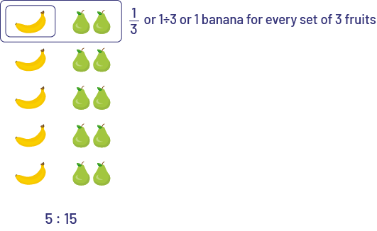 - 5 bananas for 15 fruits or \(5\;:\;15\;{\rm{or}}\;\frac{5}{{15}}\)