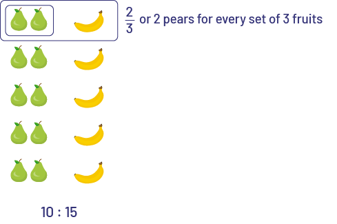 - 10 pears for 15 fruits or 10:15 or \(\frac{10}{15}\) or \(\frac{2}{3}\)