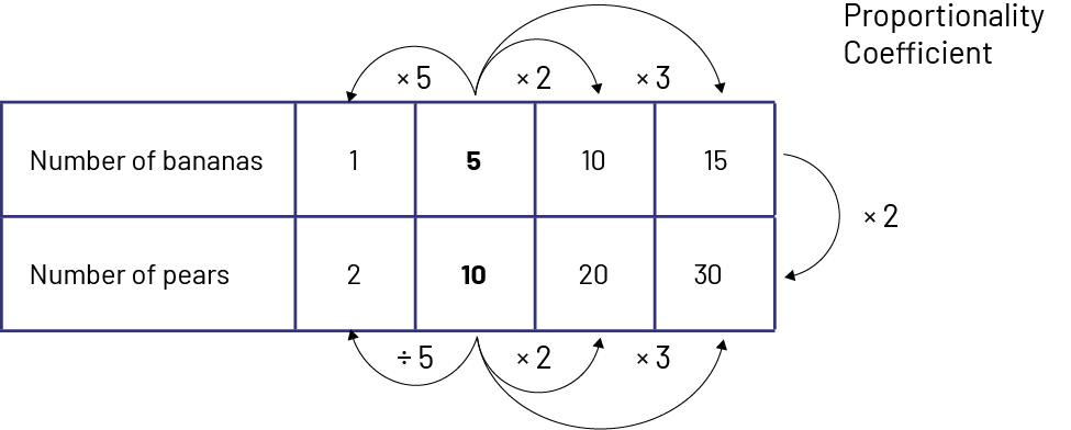 In this table, we can also recognize that there is a proportional relationship between the number of bananas and the number of pears, that is, \(\times \;2\). The proportionality coefficient is 2. We multiply the number of bananas by 2 to get the number of pears.