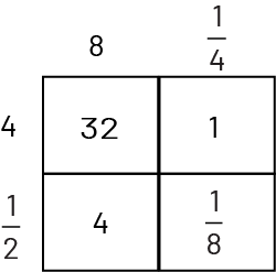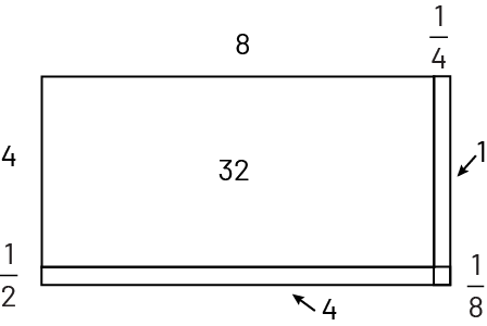 QUESTIONING How does the area model facilitate the multiplication of fractions? How did you determine where to place the whole numbers (4, 8) and the fractions \(\frac{1}{2}\text{,}\;\frac{1}{4}\)? How did you determine the numbers in the boxes? |