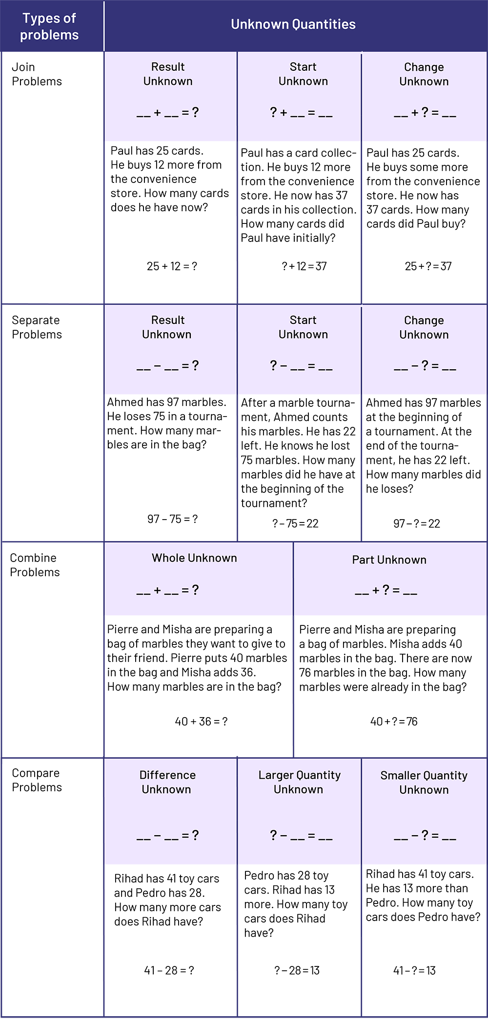 There are four types of problems in addition and subtraction: changing (joining or separating), combining (part-part-whole) and comparing problems. In order for students to understand the connections between quantities in each of these cases, it is important that they be presented with a variety of problem types. The following table presents a variety of addition and subtraction problems.