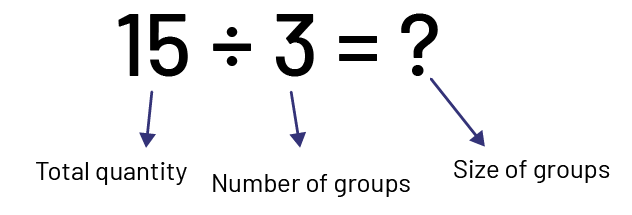 In problems presented to students, division is too often associated with only one type, namely equal-sharing (partitive division). Equal-grouping (quotative division) is usually neglected. With partitive division, the total quantity and the number of groups are known (for example, 3 students want to share 15 apples equally and we are looking for the number of apples each person will receive).