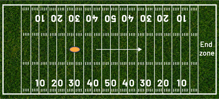 The offensive team wants to get into the end zone shown in the diagram above. The kickoff is taken from the 30 yard line, as shown by the ball in the diagram. On their next play, the offensive team gains 14 yards, but receives a 10 yard penalty.