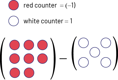 Write an equation that represents the situation represented by the two colours of counters below and invent a situation that could explain it.
