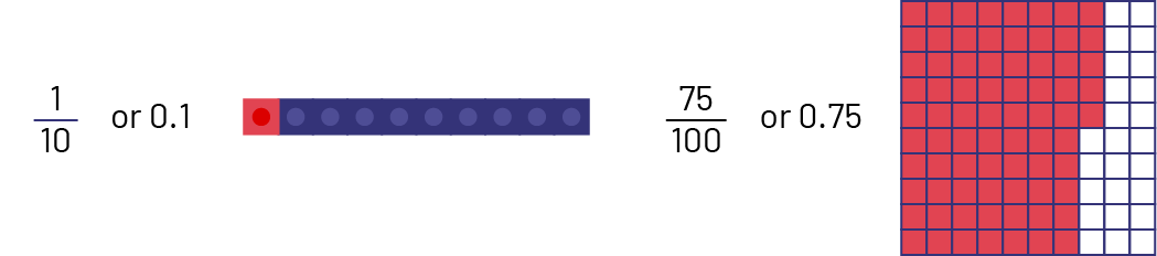 Students need to understand that since decimal notation is just another way of representing a decimal fraction (fractions with a denominator that is a power of 10), it is then possible to establish a relationship of equality between the two notations (for example, 0.3 = \(\frac{3}{{10}}\). By recognizing this equality, they are able to associate a place value with each of the digits that make up a decimal number, successively tenths, hundredths, thousandths and so on.