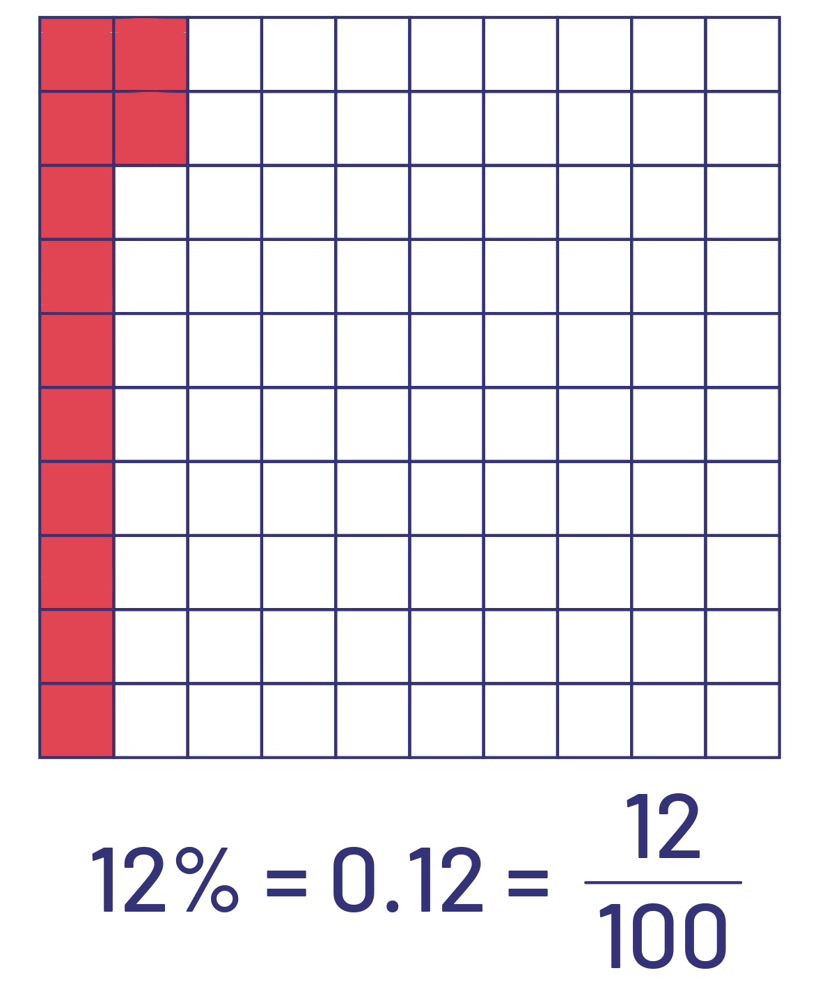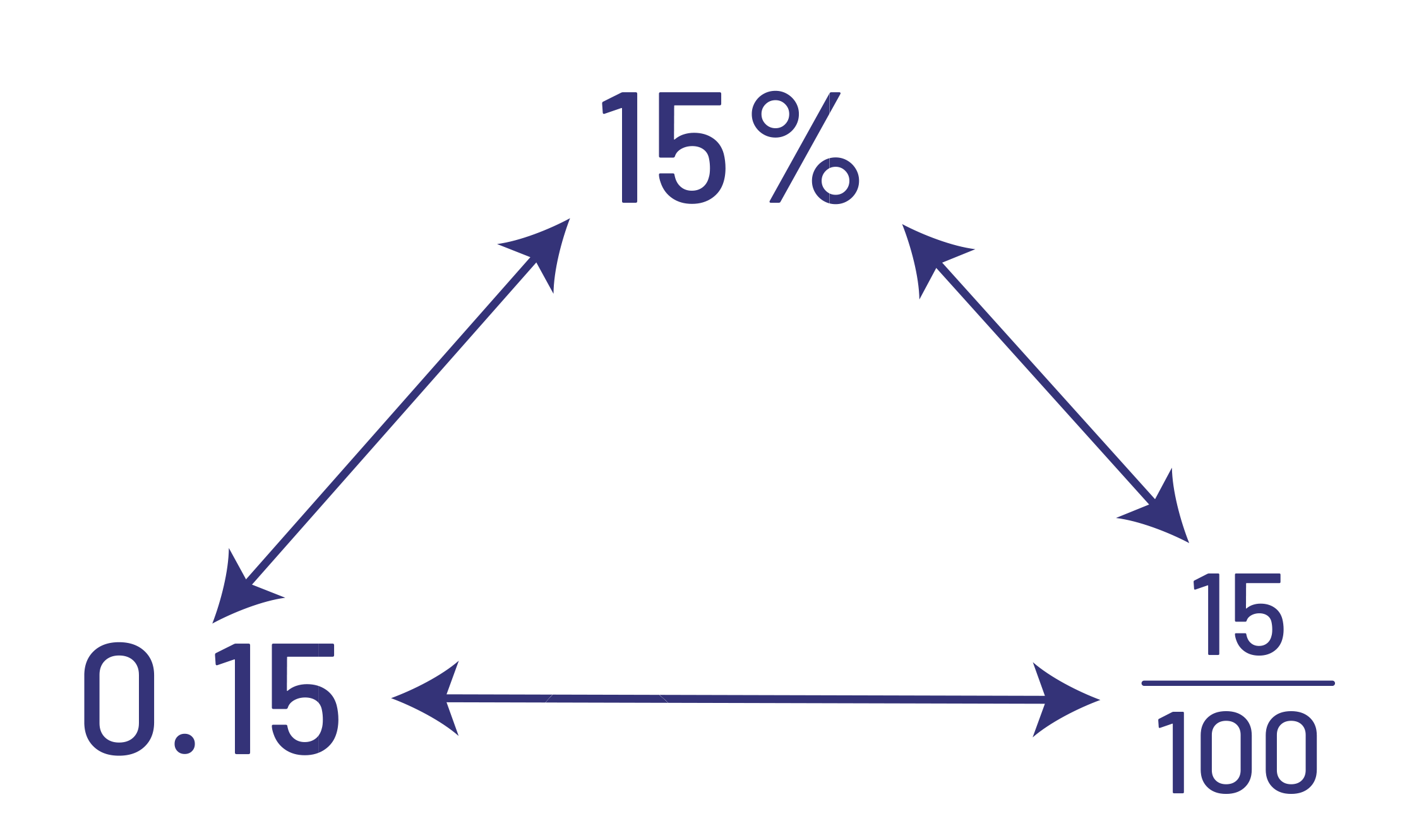 A decimal number represents a fraction whose denominator is a power of 10 (for example, \(0.3\; = \;\frac{3}{{10}}\); \(0.47 \;=\;\frac{{47}}{{100}}\)). As the concept of percent is so closely linked to the concept of fractions, there is only one more step to take to connect the percent, the decimal number and the decimal fraction.