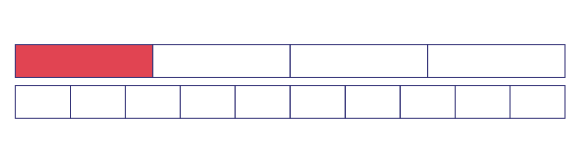 To establish the equality relationship between a fraction whose denominator is not a power of ten (for example, \(\frac{1}{4}\) and the corresponding decimal number, it is necessary to use the concept of equivalent fractions. For example, students can use strips of equal length as shown below to see that \(\frac{1}{4}\) is between \(\frac{2}{10}\) and \(\frac{3}{10}\).