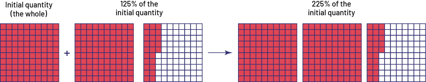 Thus, the new quantity represents \(\frac{{125}}{{100}}\) (one hundred and twenty-five hundredths) of the original quantity or 125% of the original quantity. However, an increase of 125% means that 125% of everything is added to the initial amount. The new quantity then represents \(\frac{{225}}{{100}}\) (two hundred and twenty-five hundredths) of the initial quantity or 225% of the initial quantity.