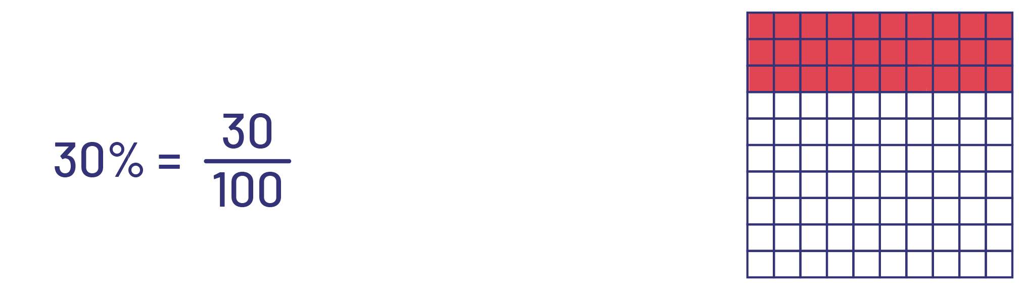 Percent is a special kind of a fraction. It is often used in everyday life. A numerical expression such as 30% (which reads "thirty percent") is actually another notation for the number thirty hundredths, or 0.30. To facilitate understanding of the concept of percent, students should first be introduced to the connection between the percent and the fraction with a denominator of 100 using concrete or visual materials.
