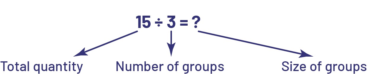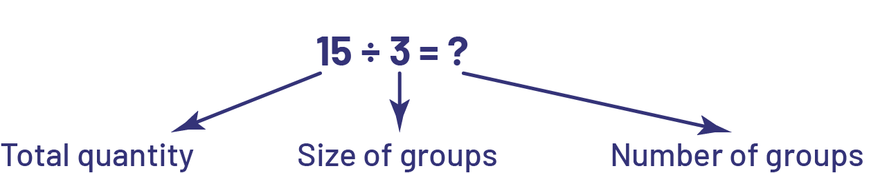 Division has a grouping meaning (quotative division or “measurement division”) when the total quantity and the number of items in each group (group size) are known (for example, we have 15 apples and we want to put them in bags, 3 apples per bag; we look for the number of bags we need).