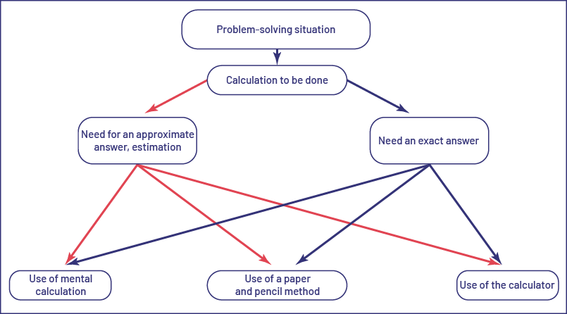 Whether it is a problem with one operation or multiple operations, students must make decisions and choices based on the context. A problem-solving approach will introduce them to this thinking. When faced with a problem, they must first analyze it to determine the data and understand that a calculation must be performed. Then, depending on the context, one must know whether one is looking for an approximate or an exact answer. In both cases, depending on the context and the numbers involved, it is then necessary to determine whether the calculation will be performed mentally, in writing or using a calculator. Finally, the desired calculation is performed.